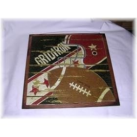 Gridiron Wooden Football Sports Sign Boys Bedroom Art: Home & Kitchen. The background color is a chocolate brown color with touches of black to accent the print. We've sealed this Gridiron Football Sports print onto wood giving it a framed appearance. It measures approximately 13 inch squared by 1/4 inch thick (wood dimensions not including hanger).