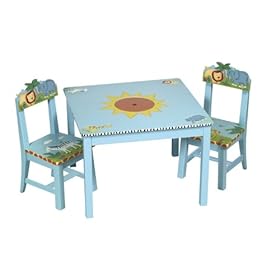 Guidecraft Safari Collection Table And Chairs Set: Toys & Games. Seat height 12. Lions, giraffes and zebras abound throughout this collection of safari-themed room furnishings. c. Removable center panel with a storage bag below. Set includes a table and two chairs. Double-bolt construction on table legs. Angled legs on chairs prevent tipping. Adult assembly required.