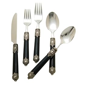 Hampton Forge San Remo 20-Piece Flatware Set with Black Handles, Service for 4: Kitchen & Dining. --Ann Bieri What's in the Box 4 place settings. Ornate in a hip, almost kitschy, way, San Remo sets a spectacular table for everyday or special occasion dining. While the business ends are crafted of brightly polished 18/0 stainless steel in traditional forms, the handles are what really stand out. Each is made of smooth, durable resin in a choice of black or cream, and is crowned at both the throat and end by ornamental metalwork. This flatware will make you want to don your velvet dress or smoking jacket just to add spice to life. A good starter set, the 20 pieces in the box include four place settings, each consisting of a dinner knife, dinner fork, salad fork, soup spoon, and teaspoon. The composition of 18/0 stainless steel means the steel contains 18 percent chromium for strength yet no nickel to provide corrosion-resistance. As a result, though dishwasher-safe, San Remo should be promptly washed and dried whenever possible. The manufacturer covers the flatware with a 30-year warranty. Each place setting consists of: dinner knife; dinner fork; salad fork; soup spoon; teaspoon.