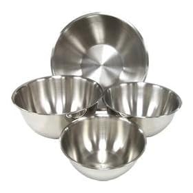 Heavy Duty Stainless Steel Mixing Bowls - Set of 4: Home & Kitchen. (1) 5 Quart Bowl. This stainless steel mixing bowl set is durable and versatile. Essential for your kitchen! Use them to cook, bake, mix, serve and much more. They are extremely sanitary and easy to clean. Great for home use, they will also stand up to rugged, every day commercial use at bars, restaurants and dining halls. Includes 3-quart, 5-quart, 8-quart and 13-quart metal mixing bowls. Get rid of your old, beaten up mixing bowls and upgrade today! In stock and ready to ship. Features: So versatile, you'll wonder how you cooked without them. Use while you cook, bake, mix serve and much more. Made of durable, sanitary 200 series stainless steel with a 0.8mm thickness. Hand wash only. Easy to grip lip around edge. Great for home or commercial use. Specs: 3 Quart Dimensions: 9 3/4W x 3 1/8H. 5 Quart Dimensions: 11 1/2W x 3 5/8H. 8 Quart Dimensions: 13W x 4 1/8H. 13 Quart Dimensions: 15 3/4W x 4 3/4H. Includes: (1) 3 Quart Bowl. (1) 8 Quart Bowl.