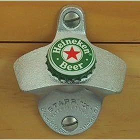 Heineken Beer Bottle Cap Starr X Wall Mount Opener: Kitchen & Dining. New in gift box. HEINEKEN Beer BOTTLE CAP Starr X wall mounted stationary bottle opener. Made with an actual HEINEKEN bottle cap! The opener is new, the BOTTLE CAP IS USED AND WILL HAVE SLIGHT IMPERFECTIONS: BENDS NICKS ETC. I have culled these bottle caps and have choosen only the best to use for these openers. It is wise, however, to consider the proverb: He who seeks perfection in a used bottle cap is destined for disappointment. That said, I think these mounted bottle cap openers look pretty sharp. Cap is permanently affixed with industrial strength adhesive. The original Starr X zinc plated cast iron opener. About 3 inches high. Screws included.
