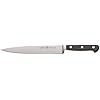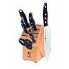 J.A. Henckels International Classic Forged 7-Piece Stainless-Steel Knife Set with Block: Kitchen & Dining. While the knives are dishwasher-safe, hand washing is recommended. Henckels is acknowledged as one of the world's finest cutlery manufacturers of high-end knives. Henckels developed its International line, featuring knives that still perform admirably in the kitchen, for a more moderate price. This seven-piece Classic set is manufactured using high-carbon stainless steel, a premium material, but one that's of slightly lesser quality than the company's other cutlery lines. The knives are well balanced in the hand, with narrow yet still heavy handles for thorough slicing. The set includes a 4-inch paring knife, a 5-inch serrated utility knife, a 7-inch hollow-edge santoku, and an 8-inch chef's knife. A 9-inch sharpening steel keeps their edges in order, and a pair of kitchen shears to snip herbs, flowers, or string is also included. Everything stores neatly in an attractive natural hardwood block. The variety of knives gives you an arsenal to handle virtually any kitchen task, from slicing vegetables and meat to mincing garlic to dividing a long loaf of French bread. Durable and attractive, the knives feature Henckels' trademark black polypropylene handles, each fastened by three rivets to the fully visible tang. Like all Henckels knives, this cutlery set carries a lifetime warranty.