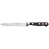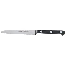 J.A. Henckels International Classic Forged 5-Inch Stainless Steel Serrated Utility Knife: Kitchen & Dining. Perfect for slicing without squashing, the knife's sharp-edged serrations slice right through soft breads as well--it's perfect for biscuits or English muffins. Along with a chef's knife, a small, serrated utility knife becomes a regular kitchen companion, especially in the summer, when there's a bounty of fresh tomatoes, peaches, and other juicy fruits and vegetables. The slender, sturdy handle, good balance, and minimally flexible blade make this an excellent value, and it's got the same lifetime guarantee as other Henckels products.