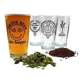 Hopspeak Pint Beer Glass Collection - Set of 4: Kitchen & Dining. (1) Drink Beer Die Hoppy inch Pint Glass. This awesome beer glass set is all about the brew - just like you are. Each pint is emblazoned with an original design and they can hold your liquids like you wouldn't believe. Funny beer glasses are always amusing but these solid glass wonders are so much more. Not only are they witty, they let everyone know just how passionate you are about your beer. In stock and ready to ship. Features: Made of solid glass. Attractive black lettering. Each glass features a clever beer related design. Made exclusively for KegWorks in the USA! Specs: Dimensions: 3 1/2W x 5 3/4H. Capacity: 16 oz. Includes: (1) In Hops We Trust inch Pint Glass. (1) Good For What Ales You inch Pint Glass.