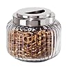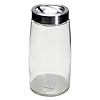 Housewares International Large 108-Ounce Chalk Label Glass Storage Jar with Brushed Metal Lid, Includes Chalk: Kitchen & Dining. Large 108-ounce capacity. Store your food and other items with flair and functionality. Attractive, high-quality clear glass in round design to easily see what's stored inside. Handy, reusable label area to write with chalk the description of your contents, expiration dates, personalize with names, etc. Tight-fitting metal lid keeps food and other items fresh, dry, pest-free and ready at your fingertips. Ideal for storing candy, cookies, pasta, snacks, flour, sugar, rice, beans, tea bags, loose tea leaves, popcorn kernels, whole grains, coffee, cereal, and even birdseed and pet treats. Also useful in the bathroom or office to store cotton balls, hairbands, cotton swabs, rubber bands, arts and crafts, scrapbooking materials, sewing supplies or candy for your desk. Easy to clean and dishwasher safe. 6-3/4 by 7.2 by 7.2-inch.