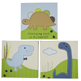 Jill McDonald Adorable Dino 3 Piece Wood Frame Wall Art: Baby. Featuring 3 of the whimsical dinosaur characters from the Adorable Dino nursery collection, one print has the saying making my mark on the world inch to encourage your little one to do the same. Jill McDonald has designed this 3 piece canvas print collection as a perfect finish to your little boy's room.