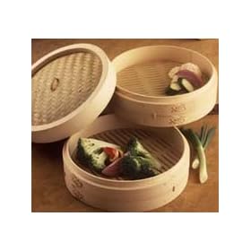 Joyce Chen 3-Piece 12-Inch Bamboo Steamer: Kitchen & Dining. Made of naturally sustainable bamboo, the steamer will not swell, split, or absorb moisture, and it effectively retains heat to ensure a flavorful, evenly cooked meal. For healthy, flavorful cooking at home, turn to this three-piece bamboo steamer. Measuring 12 inches in diameter by about 6-2/7 inches high, it can accommodate a whole meal--place chicken and potatoes on one level and a medley of broccoli, zucchini, and bok choy on the other. Its dual-level design makes it possible to steam twice as much at the same time as a traditional steamer. Simply arrange any assortment of food on one or both tiers, cover with the double-woven bamboo lid, set the steamer in a wok or over a sauce pan that has a little water in it, and heat the water. Steam cooking does not require the use of any oil or butter, which allows for low-fat healthy options, plus it preserves more vitamins and nutrients than other cooking methods. The lower level of the steamer will cook food more quickly, so use it for larger items; the top tier works well for vegetables or smaller pieces that require less cooking time.