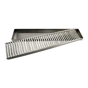 Kegerator Countertop Drip Tray - 19 inch - Stainless Steel: Kitchen & Dining. Ideal for high volume bars. Keep your counter clean with this stainless drip tray! Made of durable steel, it fits perfectly under your draft beer tower. Using a beverage drip tray is the perfect way to catch trickles and spills before they make a mess and this one has a removable grate, so it's always easy to clean at the end of the night! In stock and ready to ship. Features: Made of durable stainless steel. Catches drips and spills to prevent stains and messes. Removable grate for easy cleaning. NO drain, must be emptied manually.
