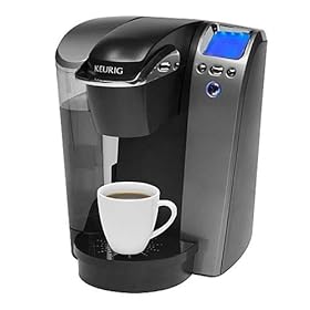 Keurig B-70 B70 Platinum Single-Cup Home Brewing System: Kitchen & Dining. The machine also allows for choosing the standard brew temperature from 187 degrees F to a hotter 192 degrees F. Ideal for both everyday use and for entertaining, this 1500-watt countertop appliance brews one fresh cup of gourmet coffee, tea, or hot cocoa at a time. Not only does the single-cup home-brewing system ensure the freshest results (no more bitter coffee sitting in a carafe, going more bitter and stale with each minute), but it also makes it possible to customize drinks, since one guest might prefer regular while another decaf or hot tea after dinner. The unit uses patented K-Cups, which offer over 200 varieties of pre-measured gourmet coffee, tea, and cocoa from a wide range of premium brands. It can also produce hot water for making hot cocoa from a packet or for use in cooking. When ready to brew, simply open the lid, insert a K-Cup, close the lid, and select a cup size from its one-touch control panel, which comes with a user-friendly blue backlit LCD display. Five brew-size options include a 3-1/4-ounce iced beverage, small 5-1/4-ounce cup, 7-1/4-ounce small mug, 9-1/4-ounce large mug, and an 11-1/4-ounce travel mug. After setting the digital clock, the unit can be programmed to turn on at a pre-determined time, which avoids having to wait the four minutes for it to heat up; it can also be set to turn off automatically from one to nine hours later for energy-saving convenience. Other highlights include a blue-lit removable 60-ounce water reservoir (holds up to 10 cups), a descale indicator, a removable drip tray that allows for easy cleanup and the use of travel mugs, and dishwasher-safe parts (the K-cup holder and funnel).