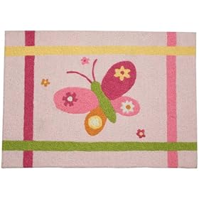 Kids Line Mosaic Garden Rug: Baby. This wonderfully designed and delightful 30 inch x 40 inch rug, features a large bright pink, rose, and green butterfly floating on a light pink field with a colorful matrix border.