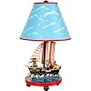 Kids Line Lamp Base and Shade, Pirate Party: Baby. The lamp also includes an on/off in-line switch, an EVA protection bottom, is UL/CSA certified. Light up your nursery with this hand-painted resin lamp base featuring Kids Line's zebra pirate on the look out and pirate monkey at the helm of the ship. Topped off with a light blue flared lampshade with stripe trim. Height of lamp is 16 inch x 10.