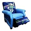 Kidz World Disneys Toy Story 3 Kids Recliner: Furniture & Decor. Recessed cupholder in right armrest. Woody, Buzz, and Jessie are ready to take your child along on their next adventure on the Kidz World Disney's Toy Story 3 Kid's Recliner, while their alien friends wave from the footrest. This recliner has a safe recline mechanism -- no more pinched fingers! Your child will need to pull out the footrest before he can recline, keeping his fingers out of the way during opening and closing. When the chair is in the recline position, the space between the seat and footrest has a sewn-in strip of fabric covering it. A recessed plastic cupholder in the right armrest gives your child easy access to a favorite drink, and the polyester fiber fill provides soft cushioning. The recliner's back has a single horizontal tufted stitch in the midsection, and is overstuffed to give it a rounded appearance -- just like Dad's favorite recliner. Additional Features:Chair bottom covered with mesh upholstery clothSpace between chair and footrest has sewn-in fabricBackrest is over-stuffed to give large, rounded top About Kidz World A.D. Blount, Linda Blount, Alison Nichols, Justin Nichols, and Dwight Griffin established Kidz World furniture in March of 2009 after looking at the children's furniture market and deciding that better quality and more fabric choices were needed. They decided to manufacture children's furniture that was more like adult furniture in terms of hardwood frames, foam filling, and other high-quality components. By providing this quality and offering the resulting furniture in a variety of fabrics, including licensed fabrics such as Mossy Oak, National Football League, Collegiate Sports, and Major League Baseball, Kidz World has quickly established themselves as the leading manufacturer of children's furniture. Mixed hardwood frame; steel recline mechanism. 4 plastic legs; polyester fiber fill. Toy Story 3-patterned fabric upholstery. For children ages 3 to 7, up to 75 lbs..