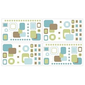 Kimberly Grant Spa Baby Wall Decals: Baby. Wall Decals come with 4 sheets of assorted stickers. Kimberly Grant Spa Baby Wall Decals is a mid century modern design with contemporary shapes. It comes with detailed appliqué and embroidery in a mix of textured fabrics. In colors of soft teal, tan and taupe. Wall decals are self adhesive, removable and reusable.