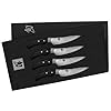 zx kitchen Black Ceramic Knives - Set of four 5 inch Steak Knives: Kitchen & Dining. Do not leave at the bottom of the sink or drawer where other items can be piled on top of them. zx kitchen has taken ceramic cutlery to a new level by developing a line of products that are both elegant and strong, and whose features make it easy and safe to use. Made from Zirconium Oxide, the hardest material after a diamond, the ceramic blade is sharper than steel and can achieve superior sharpness for 5 years without the need for sharpening. Unlike steel, ceramic knives are lightweight and easy to handle, so there is less fatigue when cutting tasks are repeated. Ceramic knives are chemically inert and do not deposit metal ions into the food - meaning no rusting, no discoloration of foods, and no metallic taste, all of which can be produced by steel. An added plus is that ceramic is a non-stick surface, making it easy to clean. zx kitchen knives are designed with a comfort grip rather than hard plastic handle so they rest smoothly in your hand. The blade does not protrude out of the handle, so your knuckles are safe while cutting and slicing. White ceramic can stain, so zx kitchen only makes knives using black ceramic blades. They are sleek in design and make a beautiful addition to any kitchen or table. zx kitchen knives come in a beautifully designed box with a magnetic closure, making them the perfect gift. Sheath covers are also available for all zx knives. By their very nature, ceramic knives need to be handled with care. They are not intended to cut bone or other hard foods. Do not use for carving, prying, or scraping. Do not try to sharpen. Avoid extreme heat or shock, and keep out of the reach of children unless properly supervised. zx kitchen knives can be hand-washed or laid flat in a dishwasher. zx kitchen offers a Lifetime Warranty on all its products and guarantees that its products are free from defect in materials and workmanship.