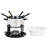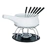Kitchen Supply 10-Piece Ceramic Cheese-Fondue Set: Kitchen & Dining. A thick handle on the fondue pot makes it easy to transport from the kitchen out to the party and onto its burner for keeping contents warm. With its sleek, modern design, this buffet-style fondue maker adds to the festive mood of any cocktail party, holiday gathering, or intimate dining experience with friends. Use it for dipping pieces of bread, meat, and/or vegetables into melted cheese or for dipping strawberries, pretzels, or marshmallows into melted chocolate as a decadent dessert. The 10-piece set includes a white 1-1/2-quart round-shaped fondue pot, a black base with a heat diffuser, an alcohol burner, and six fondue forks (each with a different colored end). The fondue pot's ceramic construction offers exceptional resistance to heat, which means it will gently diffuse the heat to the cheese to maintain a thick and smooth consistency. When finished, the ceramic pot cleans up easily by hand or in the dishwasher.
