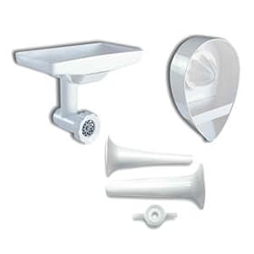 KitchenAid KN12AP Stand-Mixer Attachment Pack with Food Grinder, Sausage Stuffer, and Citrus Juicer: Kitchen & Dining. Its simple-to-assemble aluminum shaft, reamer, and shield can be quickly attached to the mixer's powerful motor to spin every drop of juice out of the citrus fruits--without seeds or pulp thanks to its handy strainer basket. Enjoy loads of food-preparation versatility with this handy stand-mixer attachment pack, which includes a food tray, a food grinder, a sausage stuffer, and a citrus juicer. Designed for use with KitchenAid stand mixers (sold separately), the pack's grinder offers a fast and wholesome way to create ground beef or chicken for patties, tacos, and more--without the additives common to store-purchased ground meats. To use, simply place cubes of meat into the food tray, press them down with the included wooden stomper, and catch the perfectly ground results from the front of the grinder. Screw the sausage nozzle onto the grinder component to create instant breakfast-sausage-size links for a savory accompaniment to scrambled eggs and toast. The citrus-juicer attachment effortlessly turns halved grapefruits, oranges, lemons, or limes into deliciously healthy drinks. Most attachment pieces can be safely washed in the dishwasher; carefully hand-wash the wooden stomper and all blade components.