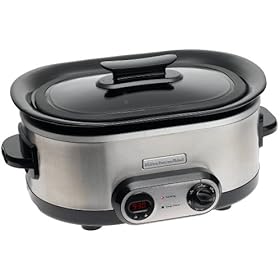 KitchenAid KSC700SS 7-Quart Slow Cooker, Stainless Steel: Kitchen & Dining. Quart markings on interior of cooking insert easily measure food servings. New KitchenAid Slow Cooker offers unparalled food safety and convenience. Programmable electronic timer with 5 cooking settings provide users with the flexibility to Keep Warm, Simmer or cook on Low, High or Auto settings. Cooker switch automatically to Keep Warm mode after program timer expires. LED lights provide a 3 Digit display with countdown cook timer for easy to program functions. 400 Watts of power and electronic temperature sensor deliver accurate temperature setting and a rapid warm up of food for safety. Ob-round, ergonomic flared rim ceramic insert helps capture condensation while providing an elegant look and solid grip area. Glass lid with silicone soft seal to maintain moisture during cooking and prevent edge chipping.