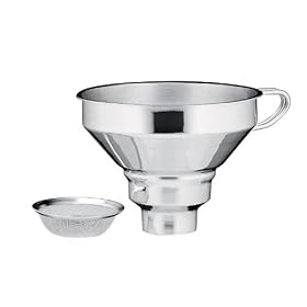 Kuchenprofi 18/10 Stainless Steel Funnel with Filter: Kitchen & Dining. Crafted of 18/10 stainless steel. Founded in Solingen Germany by Artur Schmitz in 1923, the story of Kuchenprofi is one of dilligence, innovation and refinement. Early on, Kuchenprofi realized the need for affordable functional tools that make the kitchen more efficient and more enjoyable. The name of Kuchenprofi reflects strength, quality and functionality demanded by chefs around the world. Kuchenprofi made for professionals, now available to anyone passionate about cooking. Kuchenprofi's Funnel & Filter makes it easy to strain big batches of stock or sauce, filter oil from deep fryers – even rinse delicate berries. Wide-mouth design and stable base ensure smooth, splash-less operation. Lift-out fine mesh filter traps herbs, burned bits and other unwanted particles. Dishwasher safe.