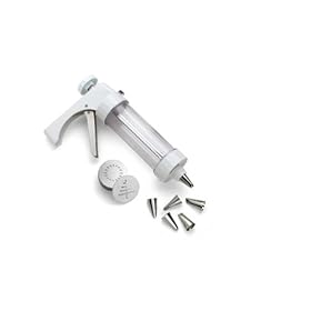 Kuhn Rikon Clear Cookie Press with Decorating Tips and Storage Box: Kitchen & Dining. Comes apart for easy clean-up and is dishwasher safe. Hearts, pinwheels, ovals and squares - make dozens of yummy cookies in a flash with the Kuhn Rikon Cookie Press. The stainless steel trigger mechanism allows easy, one-handed (whether you're left or right-handed!) cookie making using any of the 14 interchangeable disks. Included are 6 pastry nozzles for custom decorating cookies, cakes and more. Use it for filling hors d'oeuvres or piping mashed potatoes onto entrees. A see-through plastic barrel lets you quickly determine how much of the contents are left. Clear storage box keeps cookie press, disks and decorating tips together and ready for the next use.
