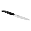 Kyocera Revolution Series Paring and Santoku Knife Set, White Blade: Kitchen & Dining. Ideal for fruits, vegetables and boneless meats. Ideal for your kitchen as well as a great gift, this 2-piece knife set includes 5-1/2-inch Santoku and 3-inch paring knives--both with white blades. The 5-1/2-inch Santoku performs a wide variety of cutting tasks, from fine chopping to dicing and paper-thin slicing. The Santoku, a Japanese-style chef's knife, features a broad blade and low tip for less rocking action than a classic European chef's knife. The 3-inch parer is ideal for peeling, cutting, shaping fruits and vegetables. And they come packaged in an in an elegant black presentation box. Packaged in an elegant black presentation box. Part of the Revolution series, Kyocera's most popular line, these knives feature ultra-sharp ceramic blades as well as a deeper profile for greater knuckle clearance. And unlike steel blades, ceramic blades will never rust or change from its natural state. Comfortable, ergonomic resin handles provide precise control, while their distinctive shape makes it both easy to find and easy to use. Kyocera has pioneered advanced ceramic kitchen knives, which are impervious to acids, juices, oils and salts, leave no metallic taste or odor, and help maintain the freshness of fruit and vegetables. The razor-sharp blade retains its original sharpness 10 times longer than steel knives. And because the ceramic blade is so light, no artificial weight is added to the handle. This creates an extremely balanced, lightweight tool that reduces fatigue during repetitive cutting tasks. I love these ceramic tools. Perfect for prep tasks and quick meals, they're the ones I always reach for. -- Ming Tsai, Emmy award-winning chef Kyocera knives are made in Japan, and they should only be washed by hand. Use on a wood or plastic cutting board. All Kyocera ceramic products are warranted to be free from defects in material or workmanship for five years. Because diamond wheels are required to sharpen ceramic knives, you should only use the Kyocera Electric Ceramic Knife Sharpener for re-sharpening at home. Additionally, Kyocera offers a complimentary re-sharpening service (shipping fee required; see more below). The Kyocera Advantage The Sharpest Blade Available According to The Cutlery and Allied Trades Research Association (CATRA), an independent testing organization: Recent tests show that the life of a Kyocera ceramic blade without resharpening is approximately 15 times that of a typical steel blade. Advanced Ceramic, or Zirconium Oxide, is extremely dense, achieving a much tighter weave than any metal material, resulting in the finest and sharpest edge possible. The Most Durable and Strongest Blade Available Manufactured in Japan, a Kyocera knife goes through a 12-step quality-controlled process. Much like a fine cigar, one knife will pass through the hands of over a dozen people from sifting through a rock material to the sintering and pressurizing process that hardens the Zirconium Oxide to the molding, shaping and lasering of the knife. The secret is in the ceramic material, extreme high temperatures and literally tons of pressure; a proprietary process resulting in a superior product. Kyocera has spent over 5 decades perfecting the art of the most durable ceramic available today. It's why other manufacturers want Kyocera either making their ceramic products or they attempt to recreate our products. This practical and beautiful knife combo set featuring two of Kyocera's best selling ceramic knives. A 5.5 inch Santoku and a 3 inch paring knife. Perfect for the home cook, these knives will be used daily, quickly becoming favorites in the kitchen. Use the Santoku for slicing, dicing, mincing, julienning and the paring knife for cutting, trimming, seeding and peeling small fruits and vegetables.