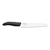 Kyocera Revolution Series 5-Inch Micro Serrated Utility Knife, White Blade: Kitchen & Dining. The 5 inch micro serrated utility blade slices paper thin slivers of tomatoes, fruits, and vegetables. Part of the Revolution series, Kyocera's most popular line, this 5-inch micro-serrated utility knife slices paper-thin slivers of tomatoes, fruits, and vegetables, and is ideal for peeling and prep work. It features an ultra-sharp ceramic blade as well as a deeper profile for greater knuckle clearance. And unlike steel blades, ceramic blades will never rust or change from its natural state. A comfortable, ergonomic resin handle provides precise control, while its distinctive shape makes it both easy to find and easy to use. I love these ceramic tools. Perfect for prep tasks and quick meals, they're the ones I always reach for. -- Ming Tsai, Emmy award-winning chef Kyocera has pioneered advanced ceramic kitchen knives, which are impervious to acids, juices, oils and salts, leave no metallic taste or odor, and help maintain the freshness of fruit and vegetables. The razor-sharp blade retains its original sharpness 10 times longer than steel knives. And because the ceramic blade is so light, no artificial weight is added to the handle. This creates an extremely balanced, lightweight tool that reduces fatigue during repetitive cutting tasks. Kyocera knives are made in Japan, and they should only be washed by hand. Use on a wood or plastic cutting board. All Kyocera ceramic products are warranted to be free from defects in material or workmanship for five years. Because diamond wheels are required to sharpen ceramic knives, you should only use the Kyocera Electric Ceramic Knife Sharpener for re-sharpening at home. Additionally, Kyocera offers a complimentary re-sharpening service (shipping fee required; see more below). The Kyocera Advantage The Sharpest Blade Available According to The Cutlery and Allied Trades Research Association (CATRA), an independent testing organization: Recent tests show that the life of a Kyocera ceramic blade without resharpening is approximately 15 times that of a typical steel blade. Advanced Ceramic, or Zirconium Oxide, is extremely dense, achieving a much tighter weave than any metal material, resulting in the finest and sharpest edge possible. The Most Durable and Strongest Blade Available Manufactured in Japan, a Kyocera knife goes through a 12-step quality-controlled process. Much like a fine cigar, one knife will pass through the hands of over a dozen people from sifting through a rock material to the sintering and pressurizing process that hardens the Zirconium Oxide to the molding, shaping and lasering of the knife. The secret is in the ceramic material, extreme high temperatures and literally tons of pressure; a proprietary process resulting in a superior product. Kyocera has spent over 5 decades perfecting the art of the most durable ceramic available today. It's why other manufacturers want Kyocera either making their ceramic products or they attempt to recreate our products. Complimentary Sharpening Service The only service of its kind available, Kyocera provides FREE knife sharpening. Customers send their knives (unlimited) to our Southern California address, paying only for shipping & handling, to get their knives professionally sharpened back to a factory edge. Each knife goes through a proprietary 5-step sharpening process on a diamond wheel and diamond belt since diamond is the only material harder than zirconium oxide. Chefs and customers get their knives back in 7-10 days as sharp or sharper than out of the box. (For more information, download and print out Kyocera Revolution Series new advanced ceramic with a deeper blade and redesigned handle for precise control. Sleek grounded, polished blade in white.