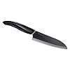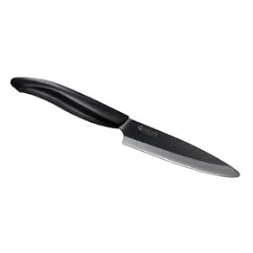 Kyocera Revolution Series 4-1/4 Inch Utility Knife, Black Blade: Kitchen & Dining. The 4.5 inch blade slices, cuts, chops, and peels and other prep work. Part of the Revolution series, Kyocera's most popular line, this 4-1/4-inch straight-edge utility knife with black blade slices paper-thin slivers of tomatoes, fruits, and vegetables, and is ideal for peeling and prep work. It features an ultra-sharp ceramic blade as well as a deeper profile for greater knuckle clearance. And unlike steel blades, ceramic blades will never rust or change from its natural state. A comfortable, ergonomic resin handle provides precise control, while its distinctive shape makes it both easy to find and easy to use. I love these ceramic tools. Perfect for prep tasks and quick meals, they're the ones I always reach for. -- Ming Tsai, Emmy award-winning chef Kyocera has pioneered advanced ceramic kitchen knives, which are impervious to acids, juices, oils and salts, leave no metallic taste or odor, and help maintain the freshness of fruit and vegetables. The razor-sharp blade retains its original sharpness 10 times longer than steel knives. And because the ceramic blade is so light, no artificial weight is added to the handle. This creates an extremely balanced, lightweight tool that reduces fatigue during repetitive cutting tasks. Kyocera knives are made in Japan, and they should only be washed by hand. Use on a wood or plastic cutting board. All Kyocera ceramic products are warranted to be free from defects in material or workmanship for five years. Because diamond wheels are required to sharpen ceramic knives, you should only use the Kyocera Electric Ceramic Knife Sharpener for re-sharpening at home. Additionally, Kyocera offers a complimentary re-sharpening service (shipping fee required; see more below). The Kyocera Advantage The Sharpest Blade Available According to The Cutlery and Allied Trades Research Association (CATRA), an independent testing organization: Recent tests show that the life of a Kyocera ceramic blade without resharpening is approximately 15 times that of a typical steel blade. Advanced Ceramic, or Zirconium Oxide, is extremely dense, achieving a much tighter weave than any metal material, resulting in the finest and sharpest edge possible. The Most Durable and Strongest Blade Available Manufactured in Japan, a Kyocera knife goes through a 12-step quality-controlled process. Much like a fine cigar, one knife will pass through the hands of over a dozen people from sifting through a rock material to the sintering and pressurizing process that hardens the Zirconium Oxide to the molding, shaping and lasering of the knife. The secret is in the ceramic material, extreme high temperatures and literally tons of pressure; a proprietary process resulting in a superior product. Kyocera has spent over 5 decades perfecting the art of the most durable ceramic available today. It's why other manufacturers want Kyocera either making their ceramic products or they attempt to recreate our products. Complimentary Sharpening Service The only service of its kind available, Kyocera provides FREE knife sharpening. Customers send their knives (unlimited) to our Southern California address, paying only for shipping & handling, to get their knives professionally sharpened back to a factory edge. Each knife goes through a proprietary 5-step sharpening process on a diamond wheel and diamond belt since diamond is the only material harder than zirconium oxide. Chefs and customers get their knives back in 7-10 days as sharp or sharper than out of the box. (For more information, download and print out Kyocera Revolution Series new advanced ceramic with a deeper blade and redesigned handle for precise control. Sleek grounded, polished blade in black.