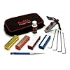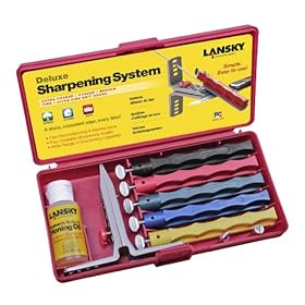 Lansky Deluxe 5-Stone Sharpening System: Sports & Outdoors. The 25-degree angle is recommended for knives that need a durable, sharp edge, such as hunting and outdoor knives. Sharpen all of your knives with ease with the Lansky Deluxe five-stone sharpening system. The system comes with five sharpening hones of different coarseness: an extra-coarse hone (70 grit), a coarse hone (120 grit), a medium hone (280 grit), a fine alumina oxide hone (600 grit), and an extra-fine ceramic hone (1,000 grit). As a result, you'll have the tools to sharpen virtually any type of kitchen, hobby, hunting, or garden knife. The system is easy to use, with a controlled-angle sharpening system built into the precision-engineered knife clamp. Simply secure the knife and choose your preferred angle and you'll receive a professional razor-sharp edge every time. Each of the four angle options is suitable for a different knife type. The severe 17-degree angle is recommended for razor blades, X-Acto blades, scalpels, and similar tools, as it provides an extremely sharp but delicate edge. The 20-degree angle is commonly used for higher-quality blades, making it ideal for kitchen cutlery and filet knives. And the 30-degree angle is recommended for heavy-duty knives that commonly cut cardboard, wire, or carpets Each honing stone is color-coded, with finger-grooved safety holders to keep your hand secure.