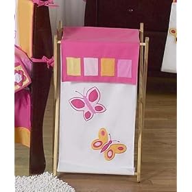 Kids Laundry Hamper for the Pink and Orange Butterfly Collection by JoJo: Baby. It fits inside the hamper and lifts out easily for convenience when emptying and toting the laundry. JoJo Designs coordinating stylish hamper matches exclusively with their JoJo Bedding Sets. Now JoJo has found a way to make even the laundry look adorable. The removable hamper body is secured to the wooden frame with corner loops and velcro. A removable mesh inner bag is also included. The fabric flap that covers the hamper opening is easily flipped out of the way when needed.