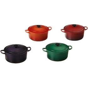 Le Creuset MG0411B-MC Farm Fresh Magnet Set: Kitchen & Dining. While it may not be made from cast iron, this adorable little piece is styled after the classic round French oven and can match your existing cookware pieces. Magnet set includes 1 Flame, Cherry, Fennel and Cassis magnets. Keep recipes, pictures and important papers close at hand and organized with a Le Creuset magnet. They're great for the refrigerator or any other metal surface in your kitchen and make a fun addition to your collection.