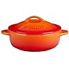 Le Creuset Stoneware 16-Ounce French Onion Soup Bowl, Cherry: Kitchen & Dining. Best of all, the colorful glaze on the exterior makes the bowl fun to mix and match with other coordinating Le Creuset pieces (sold separately), while a neutral-colored glaze on the inside offers a pleasing contrast and an optimal palette for food presentation. Sleek and stylish, this French-onion soup bowl by Le Creuset brings both beauty and versatility to any kitchen collection. The charming 16-ounce bowl, which measures approximately 6-2/5 by 4-1/5 by 2-1/2 inches, provides a cylindrical shape with a flat base and tall sides--perfect for keeping soup hot at the table. Use it for a variety of favorite soup recipes, including the classic French Onion--complete with caramelized onions, flavorful broth, and a hearty slice of French bread. Made from durable stoneware, the bowl features a hard-wearing, impermeable finish fired at temperatures as high as 2192 degrees F. With a porosity level of less than 1 percent, the bowl blocks moisture absorption, so there's no chipping, cracking, crazing, or rippling along the interior to worry about. Its non-porous construction also resists odors, scratching, and staining for hygienic use and optimal cooking performance. Even more, its high-quality enamel protects against metal marks and other damage, which means it's safe for cutting on with knives. And thanks to its unmatched thermal resistance from -65 degrees F to 500 degrees F, the bowl moves gracefully from the microwave or oven (or under the broiler) to the table for serving to the refrigerator or freezer for storing leftovers.