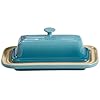 Le Creuset Stoneware Butter Dish, Red: Kitchen & Dining. Best of all, the glaze on the exterior makes the stoneware items fun to mix and match with other coordinating Le Creuset pieces (sold separately), while a neutral-colored glaze on the inside offers an optimal palette for food presentation. With its traditional French-inspired design, this stoneware butter dish by Le Creuset works well for both storing and serving butter, whether helping butter stay firm and keep its shape between meals or for softening butter before bringing it to the table. The rectangular-shaped dish, which measures approximately 7-3/5 by 4-2/5 by 3 inches, features a round-shaped knob on the removable lid for easy lifting, Le Creuset's signature concentric rings, and the Le Creuset name in raised letters for an added touch of charm. Le Creuset's line of stoneware comes with a hard-wearing, impermeable finish fired at temperatures as high as 2192 degrees F. With a porosity level of less than 1 percent, it blocks moisture absorption, which can lead to cracking, crazing, and rippling along the interior. Its non-porous construction also resists odors, scratching, and staining for hygienic use and optimal performance. Even more, its high-quality enamel protects against metal marks and other damage, which means it's safe to use with knives. And thanks to an unmatched thermal resistance from -65 degrees F to 500 degrees F, Le Creuset stoneware moves effortlessly from the microwave or oven (or under the broiler) to the table for serving to the refrigerator or freezer for storing leftovers.