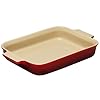 Le Creuset Stoneware 12-1/2-by-9-1/2-Inch Rectangular Baking Dish, Caribbean: Kitchen & Dining. Rounded corners and the smooth enamel coating mean food particles tend not to stick, making cleaning by hand or in the dishwasher a snap. This classic baking dish from Le Creuset is both durable and beautiful. Made from stoneware fired above 2100 degrees F for the ultimate in strength, then coated with hard enamel, the dish is superb at resisting scratching, chipping, staining, odor absorption, and cracking. The stoneware goes from refrigerator or freezer to microwave or oven to serving at the table with the aid of two sure-grip carry handles, and can even be used under the broiler. Just avoid stovetop use. Measuring 12 by 9-1/2 inches, this particular dish makes a great size for baking enchiladas, lasagna, and vegetable casseroles. Le Creuset is known for suffusing the exterior of its products with bright, modern colors, while keeping a more neutral tone on the interior. Enjoy choosing coordinating colors for your Le Creuset baking pans, pie dishes, French ovens, and more, and relax knowing each is covered by a lifetime limited warranty against defects.