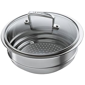 Le Creuset Tri-Ply Stainless Steel 7-Inch Steamer Insert with Glass Lid: Kitchen & Dining. Even more, it's oven-safe to 400 degrees F (200 degrees C). Measuring approximately 7 inches in diameter by 4-1/5 inches deep, this convenient steamer insert features a unique shape along the sides which allows it to fit all Le Creuset saucepans and 3-quart and 4-1/4-quart casseroles. To use, simply add water to a saucepan or casserole, and securely place the steamer over the water. Once heated, the water will release steam to healthfully cook the food inside the steamer insert--whether fresh broccoli and cauliflower, summer squash, fresh green beans--even tamales. Another thoughtful detail includes the insert's unique rim, which provides a specially designed pouring lip to prevent drips and spills, working equally well for left- and right-handed pouring. As part of Le Creuset's Tri-Ply Stainless Steel line, the cookware features a full aluminum core sandwiched between two layers of premium-quality stainless steel--from base to rim--for fast, even, all-around heat, eliminating hot spots and scorching. Its energy-efficient design also means there's no need to cook on high heat settings; medium and low heat work best for most cooking tasks. The unit's tight-fitting tempered-glass lid--with a steam vent, stainless-steel rim, and riveted loop handle--helps trap in heat, moisture, and nutrients, plus makes it possible to check on cooking foods at a glance.