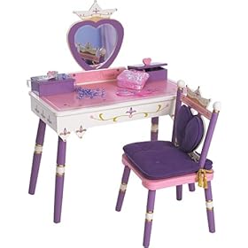Levels of Discovery Princess Vanity Table and Chair Set: Toys & Games. Also included are two heart-topped boxes with hinged lids for storing jewelry, make-up and other royal treasures - one with a music box that plays Pomp & Circumstance! The chair has a crown backrest with a removable heart-shaped back cushion and a regal padded seat cushion with gold tassels. Her Majesty's favorite things include the Princess Vanity & Chair Set! The vanity table features a heart-shaped mirror topped with a crown and the charming message, Always a Princess.