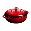 Lodge Color 3-Quart Covered Casserole, Island Spice Red: Kitchen & Dining. Although dishwasher safe, hand washing with warm soapy water is recommended to preserve the cookware's original appearance. This 3 Qt enamel covered casserole is great for cooking, marinating, refrigeration and freezing. The color porcelain enamel on cast iron can be used on gas, electric, ceramic and induction cooktops, as well as in the oven. Not recommended for use on outdoor grills or over open outdoor flames. Not for use in microwaves. Lodge Color Porcelain Enamel on Cast Iron cookware is cast from molten iron in individual sand molds. The porcelain surface eliminates the need to season cast iron. The cast iron vessel has superior heat distribution and retention, evenly heating bottom sidewalls and even the lid. Tightly fitting lid seals in moisture. The excellent heat retention reduces the amount of energy needed for cooking. Two layers of very hard, glossy porcelain enamel are chip resistant and easy to clean. Lid knob is oven safe to 400 degrees Fahrenheit. The black rim on the pot is matte porcelain, not exposed cast iron. Hygienic porcelain enamel is non-reactive with food. 11 3/4 inch diameter, 2 1/8 inch deep.
