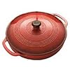 Lodge Color Dutch Oven, Island Spice Red, 3-Quart: Kitchen & Dining. Although dishwasher safe, hand washing with warm soapy water is recommended to preserve the cookware's original appearance. This 3 Qt enamel Dutch oven is great for cooking, marinating, refrigeration and freezing. The color porcelain enamel on cast iron can be used on gas, electric, ceramic and induction cooktops, as well as in the oven. Not recommended for use on outdoor grills or over open outdoor flames. Not for use in microwaves. Lodge Color Porcelain Enamel on Cast Iron cookware is cast from molten iron in individual sand molds. The porcelain surface eliminates the need to season cast iron. The cast iron vessel has superior heat distribution and retention, evenly heating bottom sidewalls and even the lid. Tightly fitting lid seals in moisture. The excellent heat retention reduces the amount of energy needed for cooking. Two layers of very hard, glossy porcelain enamel are chip resistant and easy to clean. Lid knob is oven safe to 400 degrees Fahrenheit. The black rim on the pot is matte porcelain, not exposed cast iron. Hygienic porcelain enamel is non-reactive with food. 9 3/4 inch diameter, 3 inch deep.