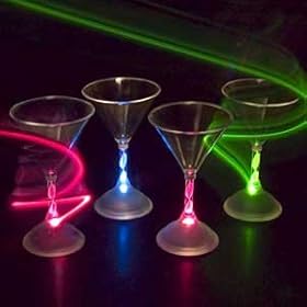 Lot of 4 of LED Light Up Flashing Martini Glasses: Toys & Games. It is made of a high quality, safe, clear acrylic, with replaceable batteries. First there were party drinks, then there were body lights (blinkies), now we bring you this 6 oz LED Light Up Flashing Martini Glass, (part of our Light-Up Barware collection,) the ultimate light-up party and bar favor! Imagine holding a luminous wine glass in your hand, where the whole glass, including the beverage inside, spin with many colorful lights! This LED Flashing Martini Glass has a Spiral DNA Stem and a Still inch setting, which allows you to light it with a single color, with 7 different colors to choose from, and a Rainbow inch mode, which cycles through each of the colors. This super-bright LED Drink Ware is sure to liven up any party or event! These will be the talk of the party and a must for every party goer! Blinkie lights help identify your drink at the party or at the bar, as well as provide a valuable safety beacon at an outdoor event! Get one for everyone in your group! Each cup can be set to a different color mode, making cup identification a no-brainer :-) Get a light-up barware item for everyone in your camp at Burning Man! Easy to replace button style batteries are included and pre-installed, and will make this cup last for a long long time.