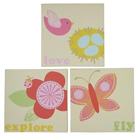 Jill McDonald Lullabye Breeze 3 Piece Wood Frame Wall Art: Baby. Featuring the bird, flower and butterfly from the Lullaby Breeze nursery collection, each print encourages your little one to Explore, Fly inch and to Love. Jill McDonald has designed this 3 piece canvas print collection as a perfect finish to your little girl's room.