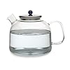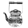 Medelco 12-Cup Glass Stovetop Whistling Kettle: Kitchen & Dining. The kettle also provides a stay-cool lid that whistles to indicate when water has reached a full boil, and it removes easily with a slight pull of the small, curved handle when it's time to pour. A modern take on the classic stovetop tea kettle, this uniquely designed item features a thermal-shock-resistant glass carafe that not only allows for viewing water as it boils, but that also helps ensure pure-tasting water--no chance of imparting off flavors to the water like with metal kettles. To use, simply fill with up to 12 cups of water, snap the lid into place, and place on the range to boil. The kettle's lab-quality borosilicate glass can be used on gas or electric stovetops; the included metal heat diffuser, shaped like a three-leaf clover, should always be placed between electric range coils and the glass carafe for safety. Other highlights include a large heat-resistant phenolic handle that offers a secure grip, a drip-free spout for graceful serving, and a rugged design that cleans up easily by hand or in the dishwasher.