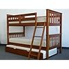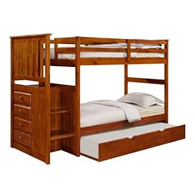 Mission Stairway Bunk Bed with Trundle - Espresso: Home & Kitchen. All of MOM'S beds are in stock, warehoused locally and ready to ship within 2 business days. Our Twin over Twin Mission Stairway Bunk Bed with Trundle in Espresso finish is carefully crafted for timeless style and lasting comfort. Expertly constructed of solid wood, the bed measures 65.5 inch high x 98 inch long x 42.5 inch wide. Bottom bunk is 11 inch off the floor. Each bunk and trundle comes with a slat roll foundation that is designed for use without a box spring or bunkie board. At MOM'S safety comes first, so all of our bed designs meet or exceed both ASTM and CSPC safety standards. All wood is sanded and sealed with a clean, smooth coating to prevent splinters. Our finishes are child-safe and lead free. Stairway provides easy access to top bunk. Each bunk accommodates a standard twin sized mattress, not included. This offer includes: (4) side rails, (2) head boards, (2) foot boards, (1)staircase, (39) slats, (1) Trundle on casters and (1) Built-in 4 - Drawer Chest. Some assembly is required. FREE SHIPPING!!! This bed ships freight - curbside delivery.