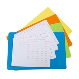 MIU France Flexible Cutting Boards, Set of 8: Kitchen & Dining. The half size boards measure 11-inches by 8.5 inches. MIU France 8-Piece polyethylene flexible cutting boards. Color coded for different food groups to minimize cross-contamination and to protect countertops. Four full size boards: orange, yellow, blue and green. Four half-size boards in white with orange graphics: conversion measurements, circular pie sizes and grid patterns. The flexible boards curl easily to transfer chopped food directly into the bowl, pot or pan. Each full size board measures 15-inches by 11-inches. Top shelf, dishwasher safe.