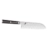 Miyabi Kaizen 7-Inch Granton Santoku Hollow Edge Knife: Kitchen & Dining. Miyabi continues to strive for perfection with the introduction of Miyabi Kaizen--Japanese for improvement or change for the better, This next generation of Miyabi Knives, made in Seki, Japan, combines the greatest hardening technology with the artistry of traditional craftsmanship, Miyabi Kaizen is crafted from VG10 super steel with a 64-layer stunning flower Damascus pattern, The exceptional blade is complemented by an equally stunning and durable handle made of black linen Micarta featuring a mosaic pin, red spacers and a metal end cap, The 7 Santoku Hollow Edge allows air between the blade and the item being cut for extra thin cutting.