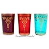 Moroccan Tea Glasses (set of 6 assorted colors): Kitchen & Dining. The set comes with 6 glasses with a colorful band surrounding ornate gold Moroccan designs. Traditional Moroccan tea glasses. Colorful, traditional, charming and authentically Moroccan Tea Glasses hold 5 fl. oz (0.15 l) and are 4 inch tall. Handmade & hand painted Moroccan tea glasses, a unique design with bright colors and beautiful art work. The band around the glass comes in orange, red, purple, blue, yellow and green.
