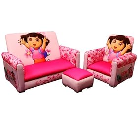 Nickelodeon 3 Piece Juvenile Set, Dora: Baby. You can create a whole room setting in these vibrant colors of pink with floral accents. Dora Set includes a sofa, chair and ottoman to create your child's very own room seating. Fun spot for your little explorer to visit with friends or watch their favorite explorer show. This set has extra touches for that designer look such as decorative front arm panels and 1.5 inch legs. The construction is hard wood frame covered with poly urethane foam and upholstered in soft to the touch, yet durable polyester fabric. The fabric is easy to clean with mild soap and water. The sofa measures 26.5W x 15.25L x 17.5H, the chair 15.5W x 15.25L x 17.5H and the ottoman is 8.5 inch square. The seat height from the floor is approximately 5. There are coordinating furniture items such as a toy box, recliner, sofas available to match this cute set. Other items sold seperately.