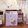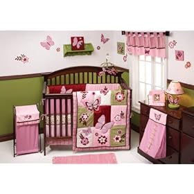 NoJo Emily 6 Piece Crib Set: Baby. The six piece set includes the comforter, bumper, sheet, dust ruffle, window valance and diaper stacker. This rich nursery collection features bold butterflies and beautiful blossoms in a lively mix of fuchsia, raspberry, pale pink, white and green. Coordinating pieces include the window valance, musical mobile, canvas wall art and wall decals, lamp and shade, appliquéd coral fleece blanket, and hamper.