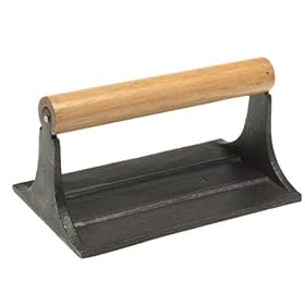Norpro Cast Iron Bacon Grill Press: Kitchen & Dining. For speeding up the bacon-frying process, the press can be preheated--also preheat it when you're flattening hamburgers, grilled sandwiches, or quesadillas. Bacon curls while frying, making it difficult to cook evenly. Long ago, cooks found a simple solution to this problem: hold bacon to its proper shape by flattening it with a heavy, cast-iron press. Norpro's press hews to that tradition. It's made of traditional cast iron and has a wooden handle that stays cool while the press is in use. Season the press by coating it with oil and heating it for 20 minutes; after cleaning it in soapy water, it should also be lightly coated with vegetable oil to prevent rust.