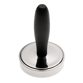 Norpro Stainless Steel Grip-EZ Meat Pounder: Kitchen & Dining. With a professional weight (26 ounces) and size (3-1/4 inches in diameter), it's heavy enough for quick work but small enough for precise maneuverability. Sooner or later, every cook needs a proper meat pounder for flattening chicken-fried steak, chicken breasts, or veal scallops, or for evening out the thickness of butterflied leg of lamb so it cooks uniformly on the grill. This one's as good as they get. Made of mirror-polished stainless steel, with a santoprene handle to provide a sure grip even when wet, this essential kitchen tool should last a lifetime.