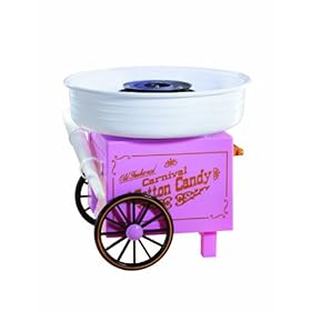 Nostalgia Electrics CCM-505 Vintage Collection Cotton Candy Maker: Kitchen & Dining. Finally, twist the flossed sugar onto one of the two included plastic cones as it collects around the basin (paper cones and other accessories sold separately). Turn backyard birthday parties or picnics into authentic carnivals with this adorable cotton-candy maker. Modeled after an antique cart--complete with vintage lettering and oversized wheels--the countertop unit offers a fun, hands-on way to whip up fluffy cones of delicious cotton candy. Furthermore, it can be used with either specialized flossing sugars (sold separately) or table sugar to create a variety of colorful, flavored treats. To operate, simply pour the sugar into the top, turn the unit on, and allow its central heating element to warm and spin the sugar into a web of sweet, finger-licking goodness. The system's removable bowl cleans up quickly by hand, and its base can be wiped easily clean with a damp cloth between uses.