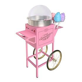 Nostalgia Electrics CCM-600 Vintage Collection Cotton Candy Cart: Kitchen & Dining. To add a little flavor and color to regular sugar, just mix a pinch of pre-sweetened Kool-Aid to the sugar. Whether it's a birthday party, barbeque, or fundraiser, this full-size cotton-candy machine makes any fun occasion all the more festive. The unit features separate switches for turning on and off the heating element and the motor, and its anti-vibration, hydraulic spinning head ensures perfect, fluffy results. Simply pour sugar into the top, turn the unit on, and instantly make fresh carnival-style cotton candy. The unit works with regular sugar or a variety of flavored sugars that can be found on the Internet and at various local grocery stores. Resembling circus-style cotton-candy carts of the early 1900's, the unit provides a convenient tray with a handle bar, a side rack that can hold up to six cones, two smooth-rolling wheels, and an easy-to-clean design.