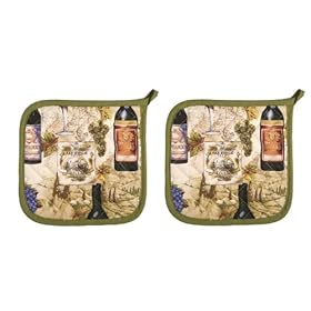 Now Designs Basic Potholders, Wine Labels, Set of 2: Home & Kitchen. Silver acrylic coated cotton on reverse side offers major heat protection while lifting and moving items from your stove or oven. For over 45 years, Now Designs has created fashionable, fun, and functional kitchen textiles, table linens, gifts and decorative accessories for the home. Whether it's kitchen basics, fashionable, trendy designs or gifts for any season, Now Designs' quality and workmanship is unsurpassed. This set of two matching potholders are made of cotton with polyester fill. Set includes two matching potholders, each measuring 8 by 8-inch square.